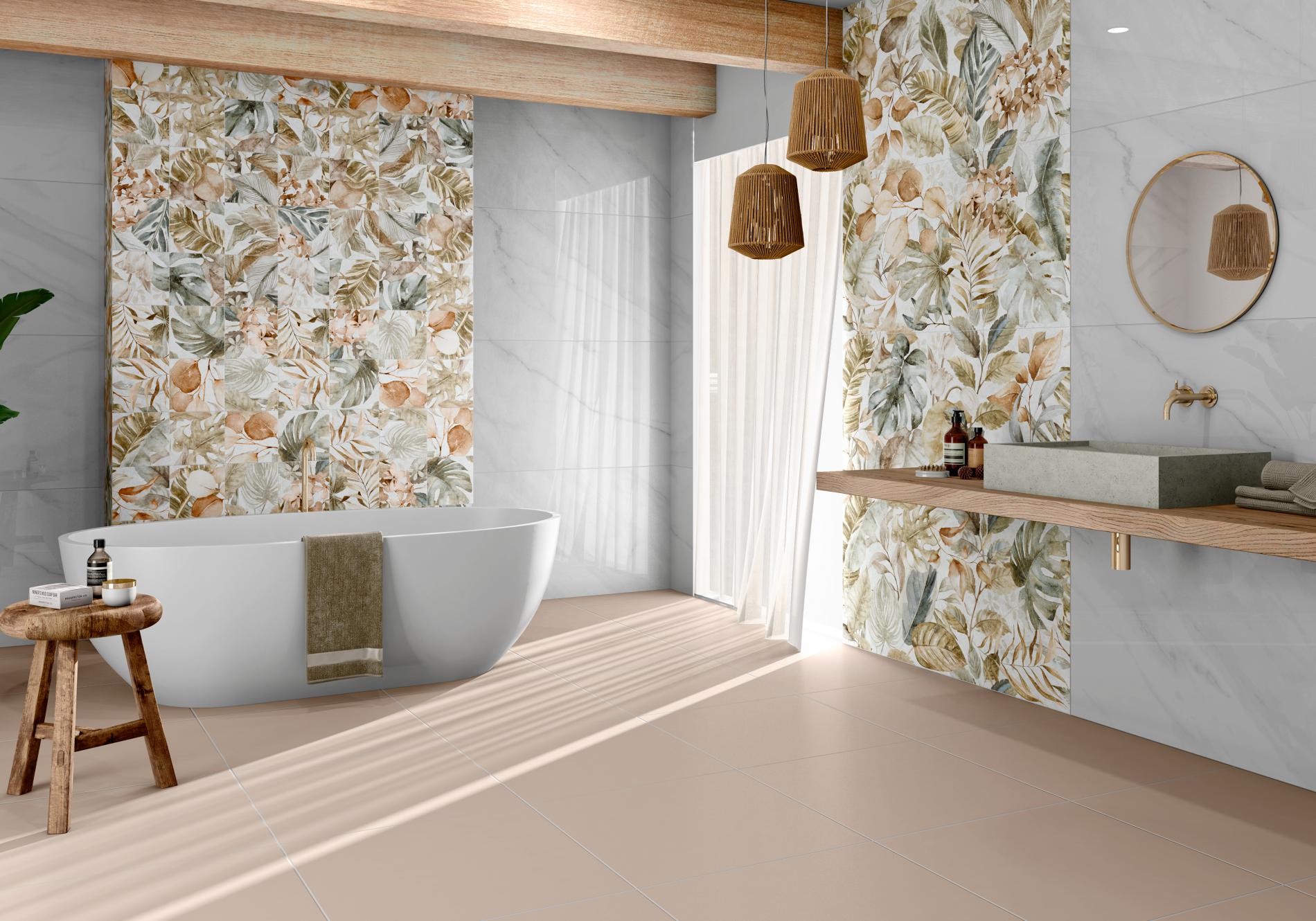 Ce carrelage est idéal en combinaison avec des séries plus neutres comme pierre ou béton, pour créer un équilibre visuel.