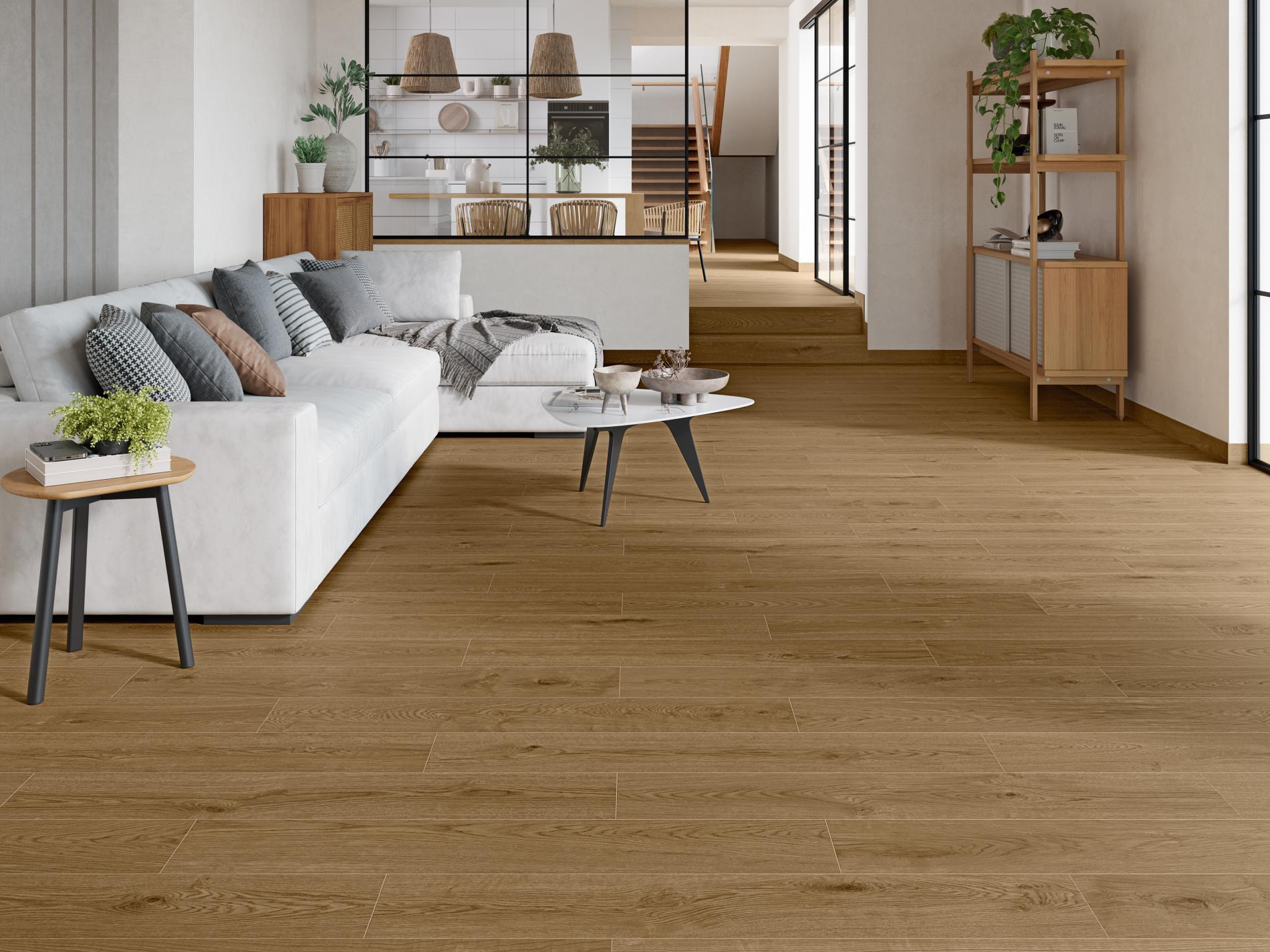 Son format allongé 20×120 cm imite parfaitement les lames de parquet, créant une sensation de continuité et d’espace dans les pièces.