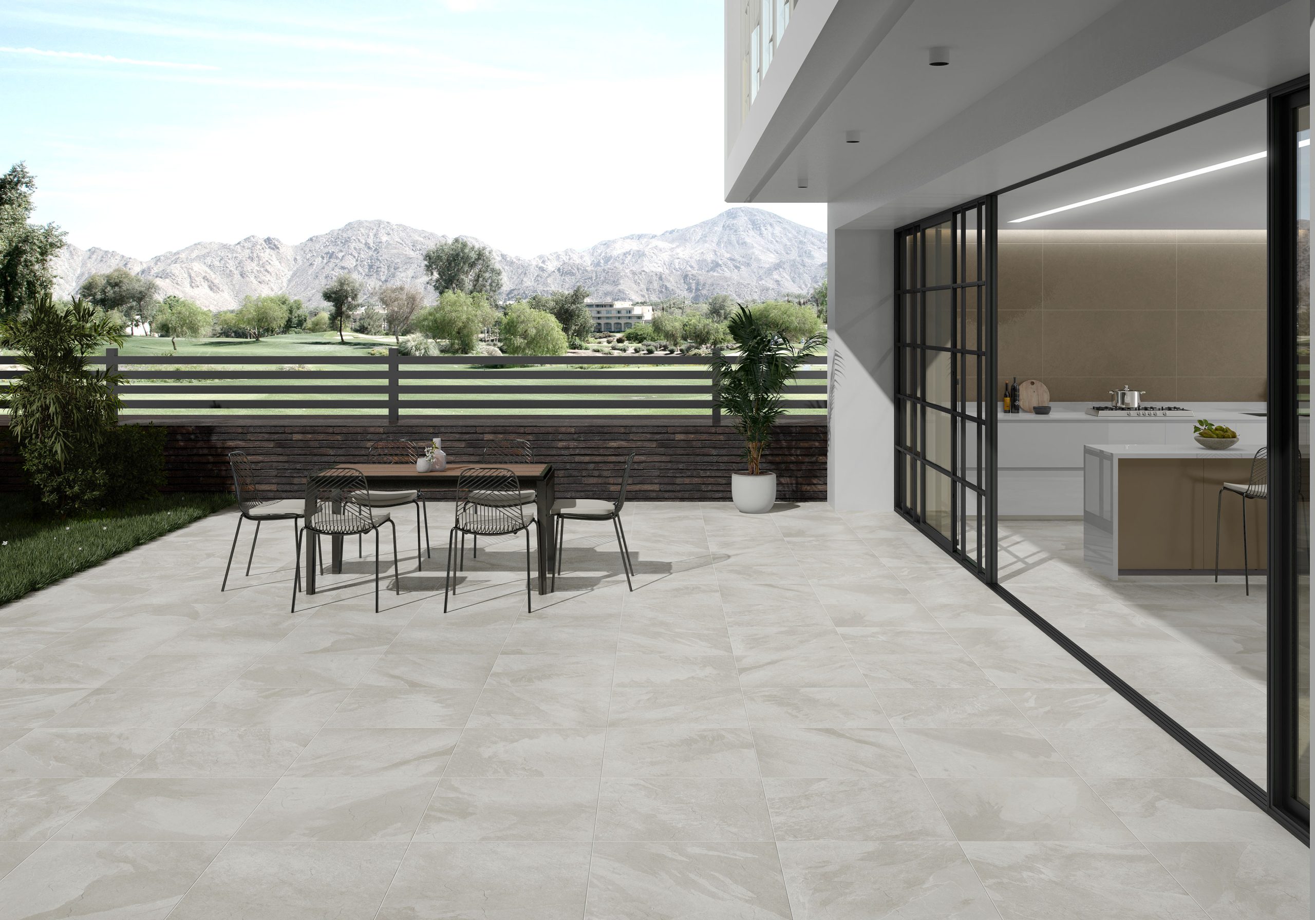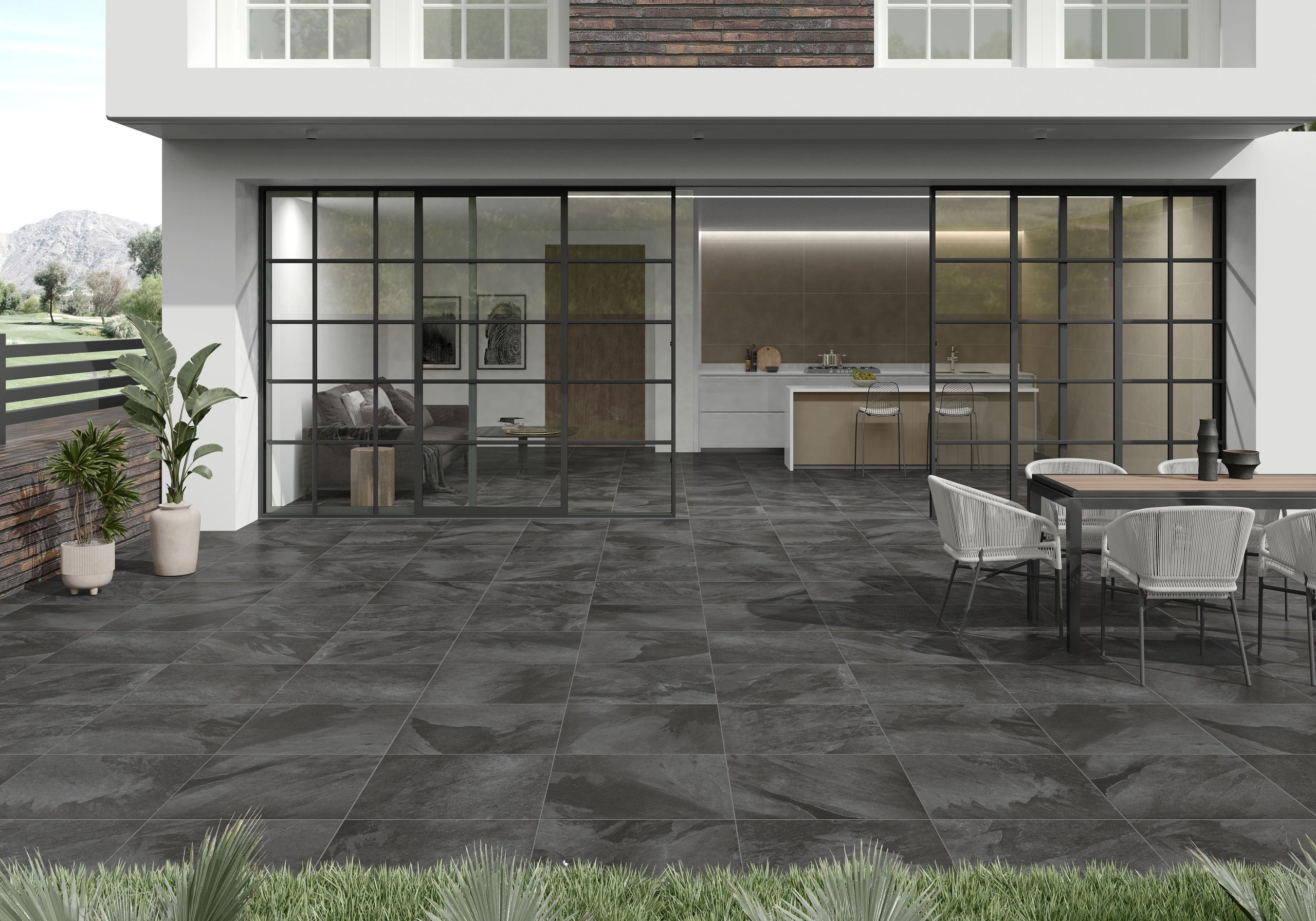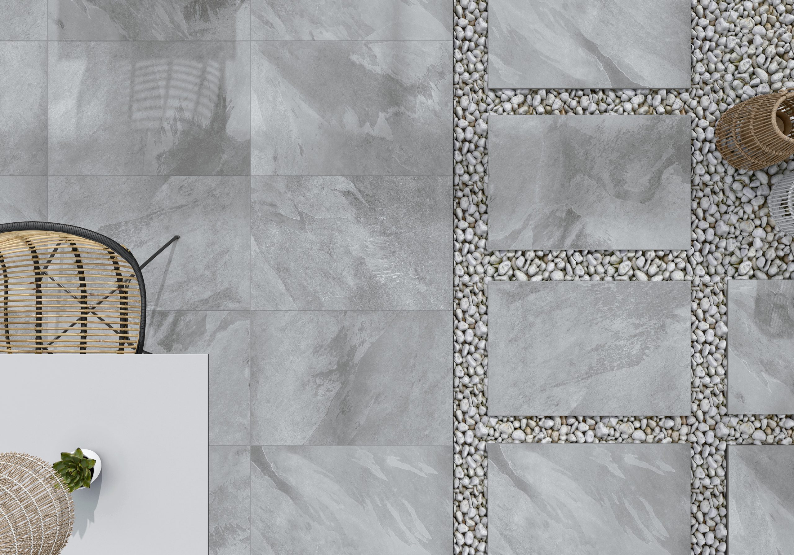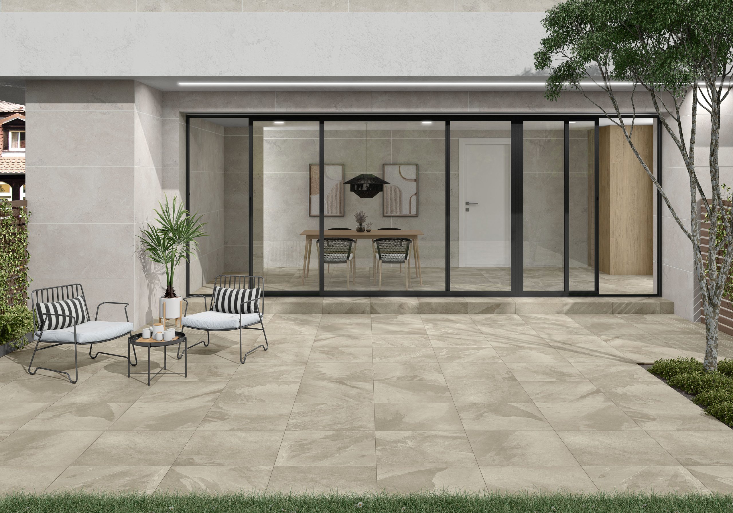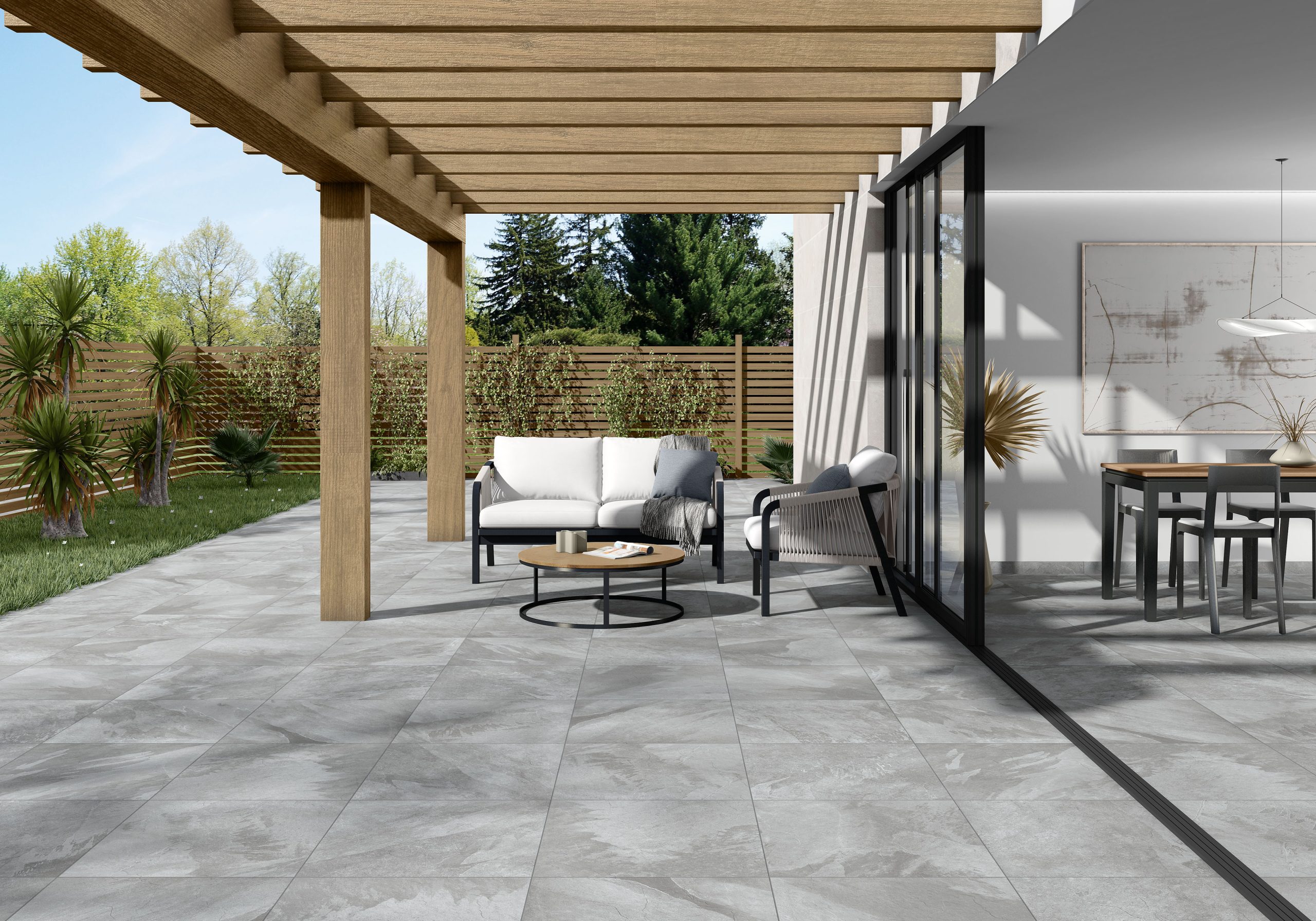 Le carrelage RHIN en 20mm est idéal pour terrasse avec un effet pierre naturelle antidérapant.
