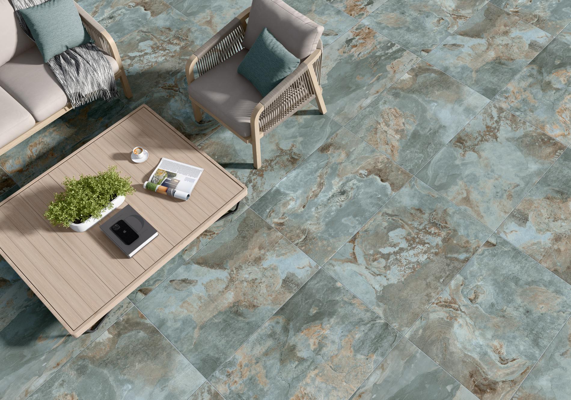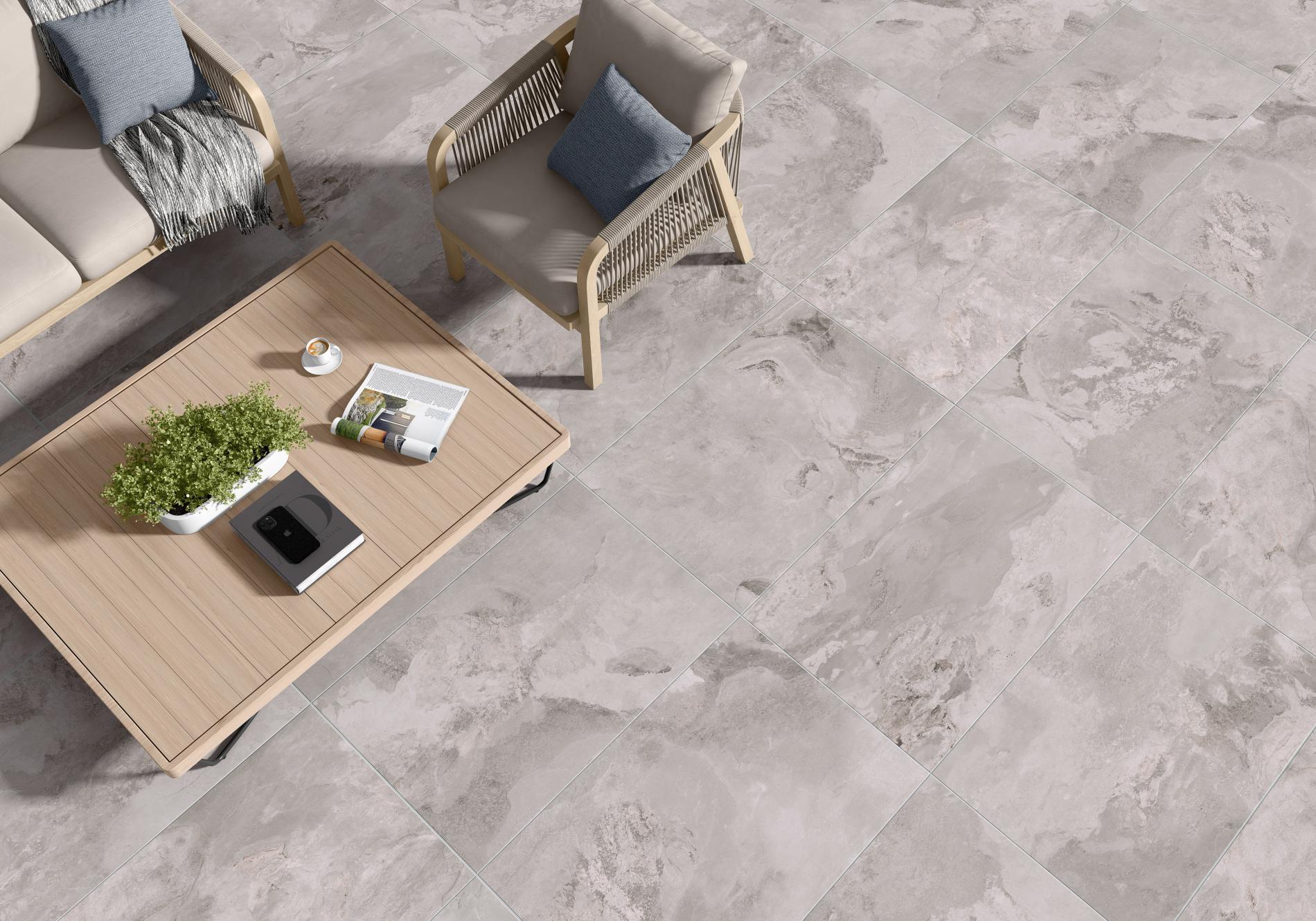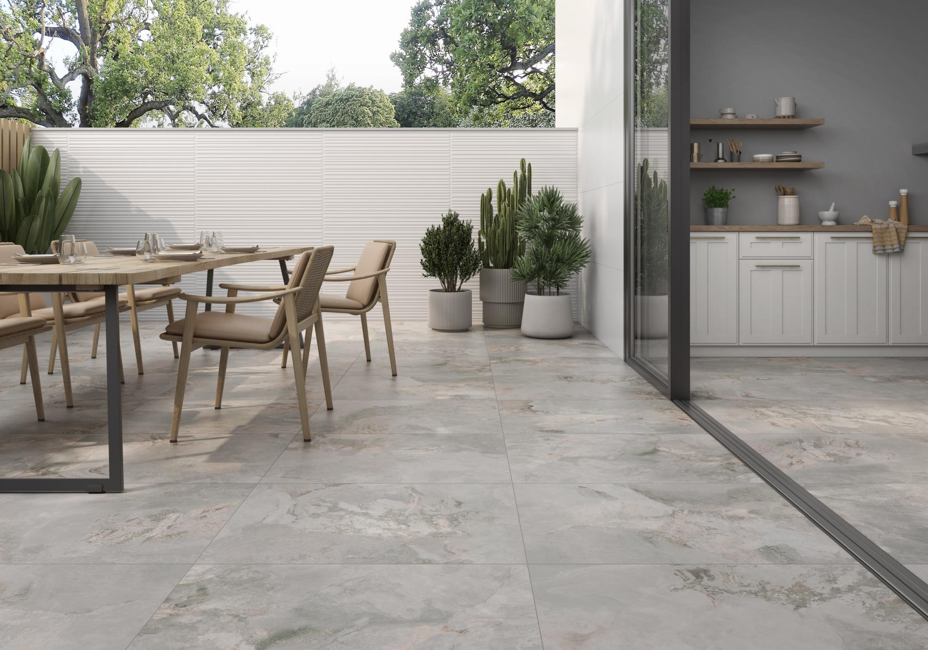 La collection OKAI propose un carrelage en grès cérame inspiré de la pierre naturelle avec une finition mate et texturée.