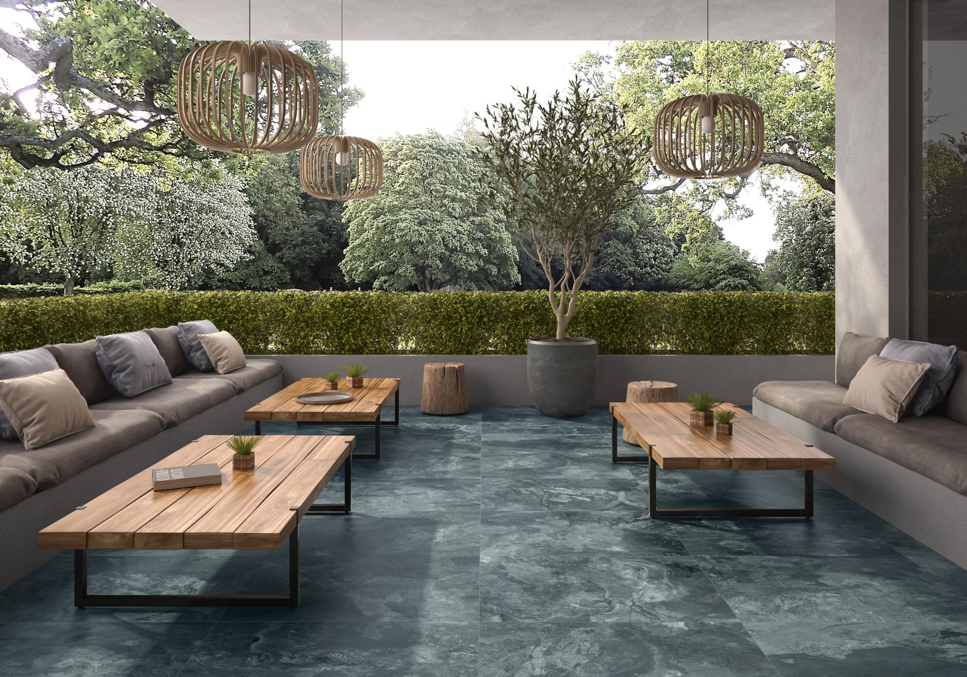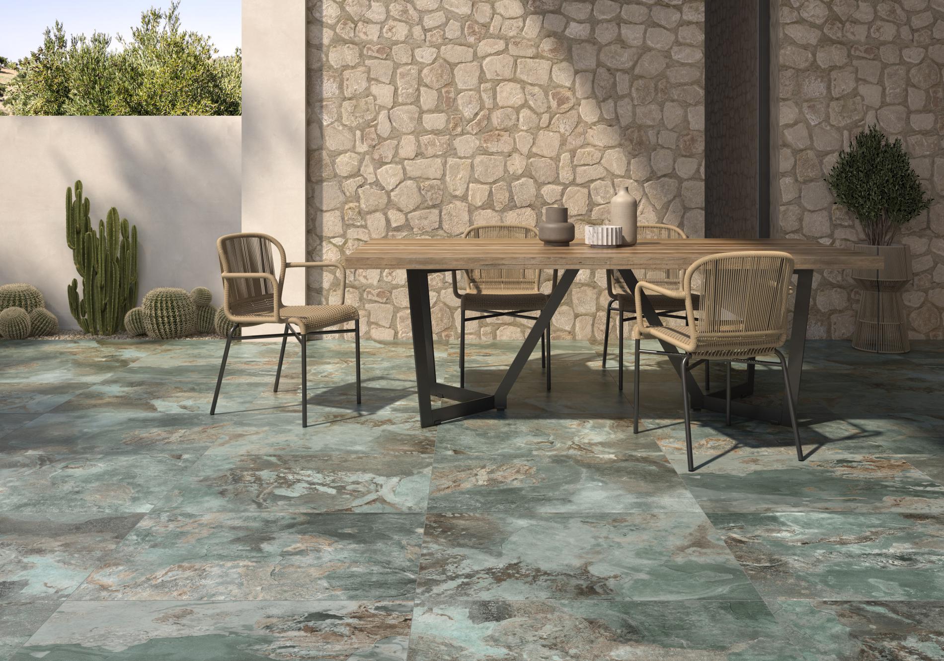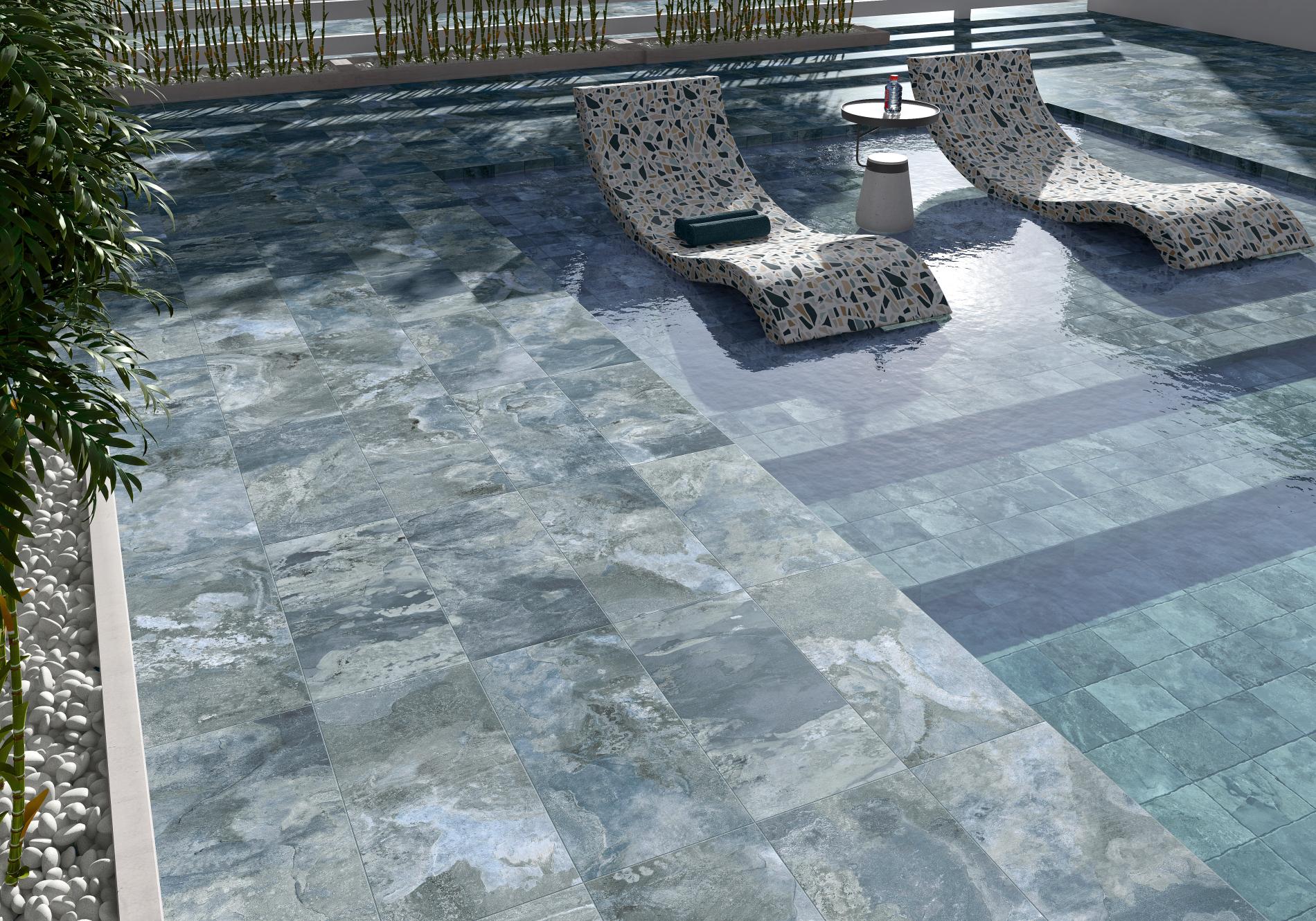 La collection OKAI propose un carrelage en grès cérame inspiré de la pierre naturelle avec une finition mate et texturée.