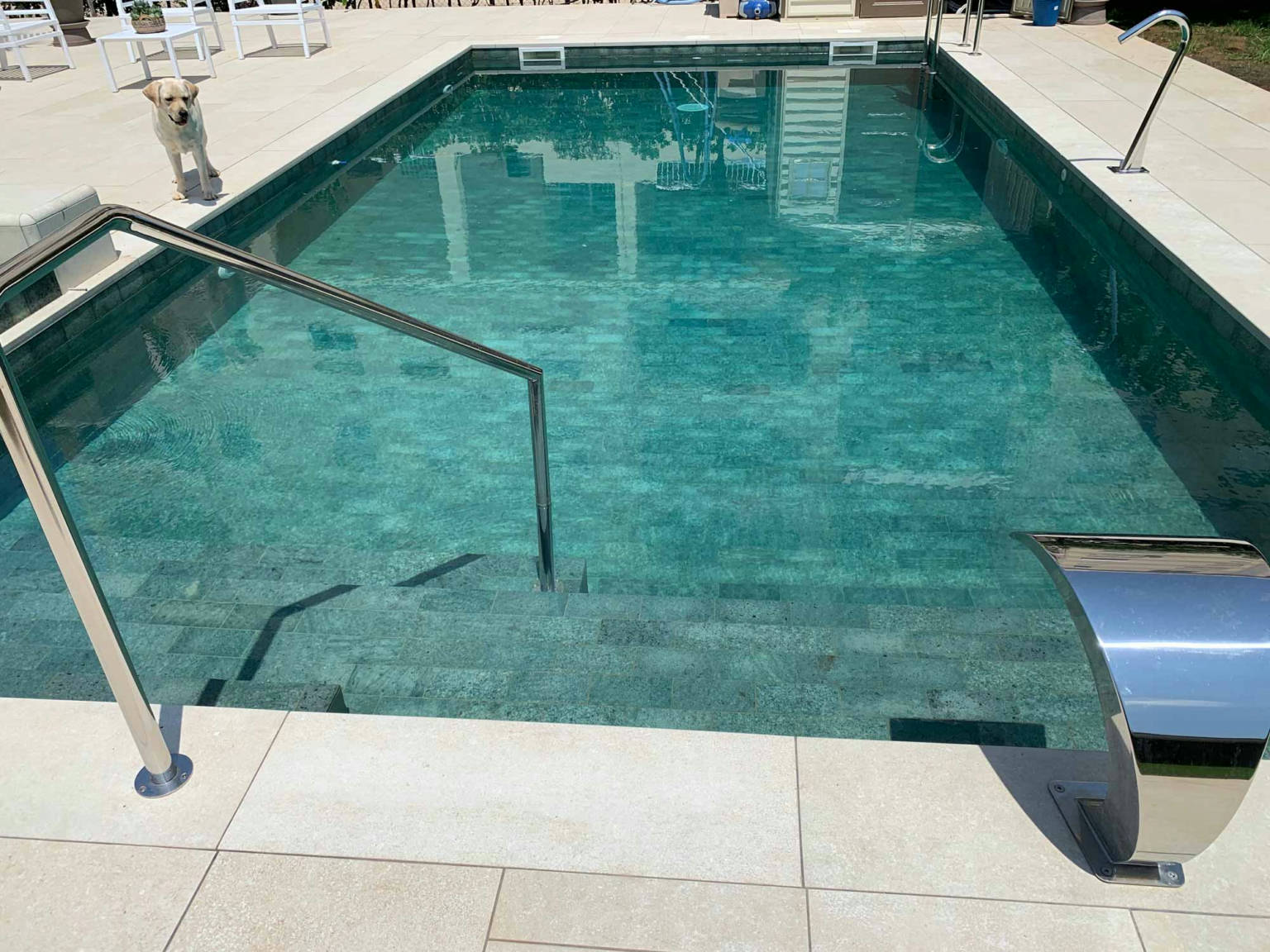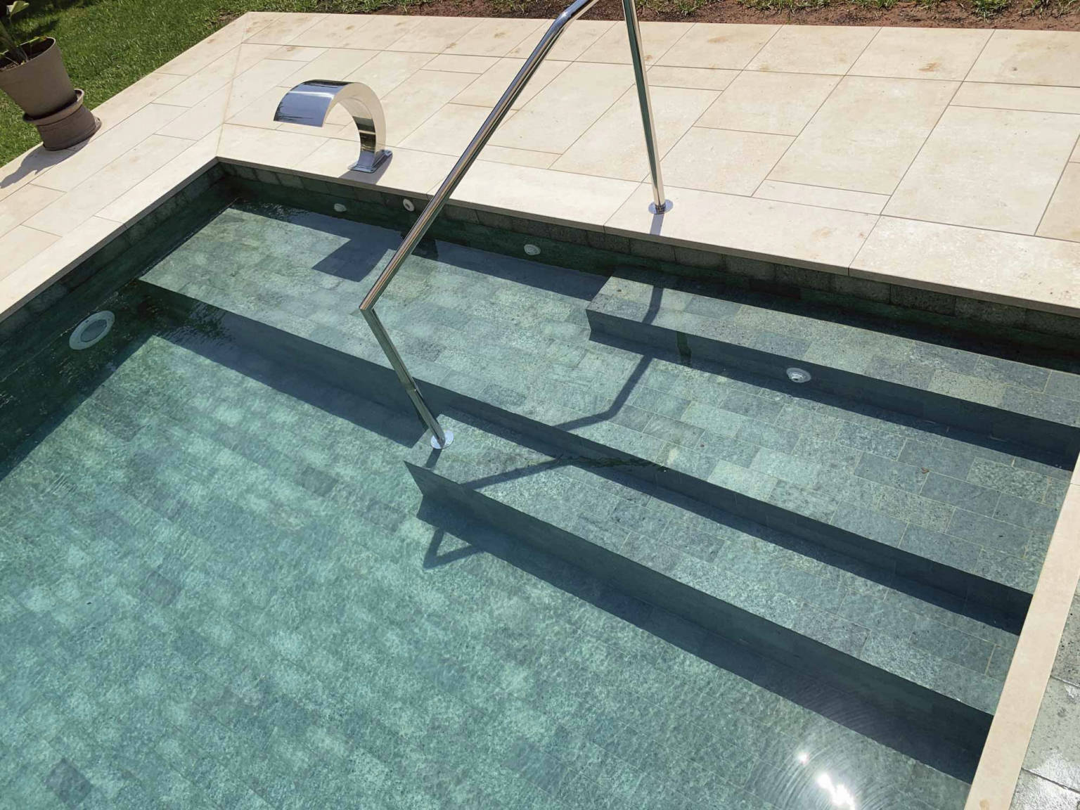 Carrelage en pierre naturelle BALI 10×20, idéal pour piscines, douches et extérieurs avec un effet eau vert tropical haut de gamme.