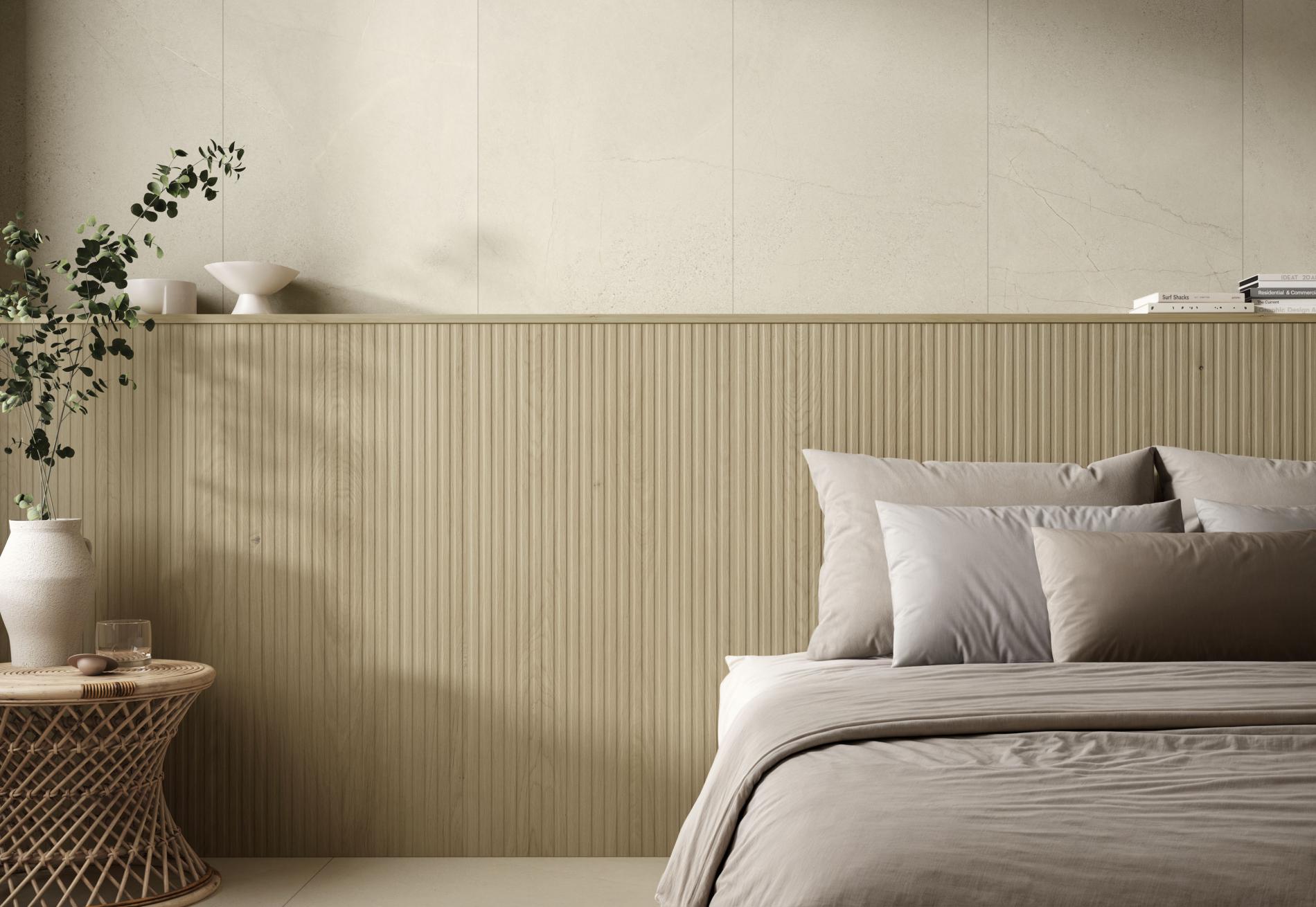 Son format 60×120 cm rectifié permet de créer des murs modernes avec peu de joints, offrant un rendu élégant et naturel.