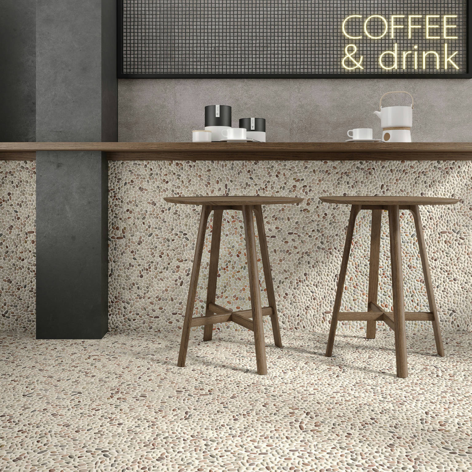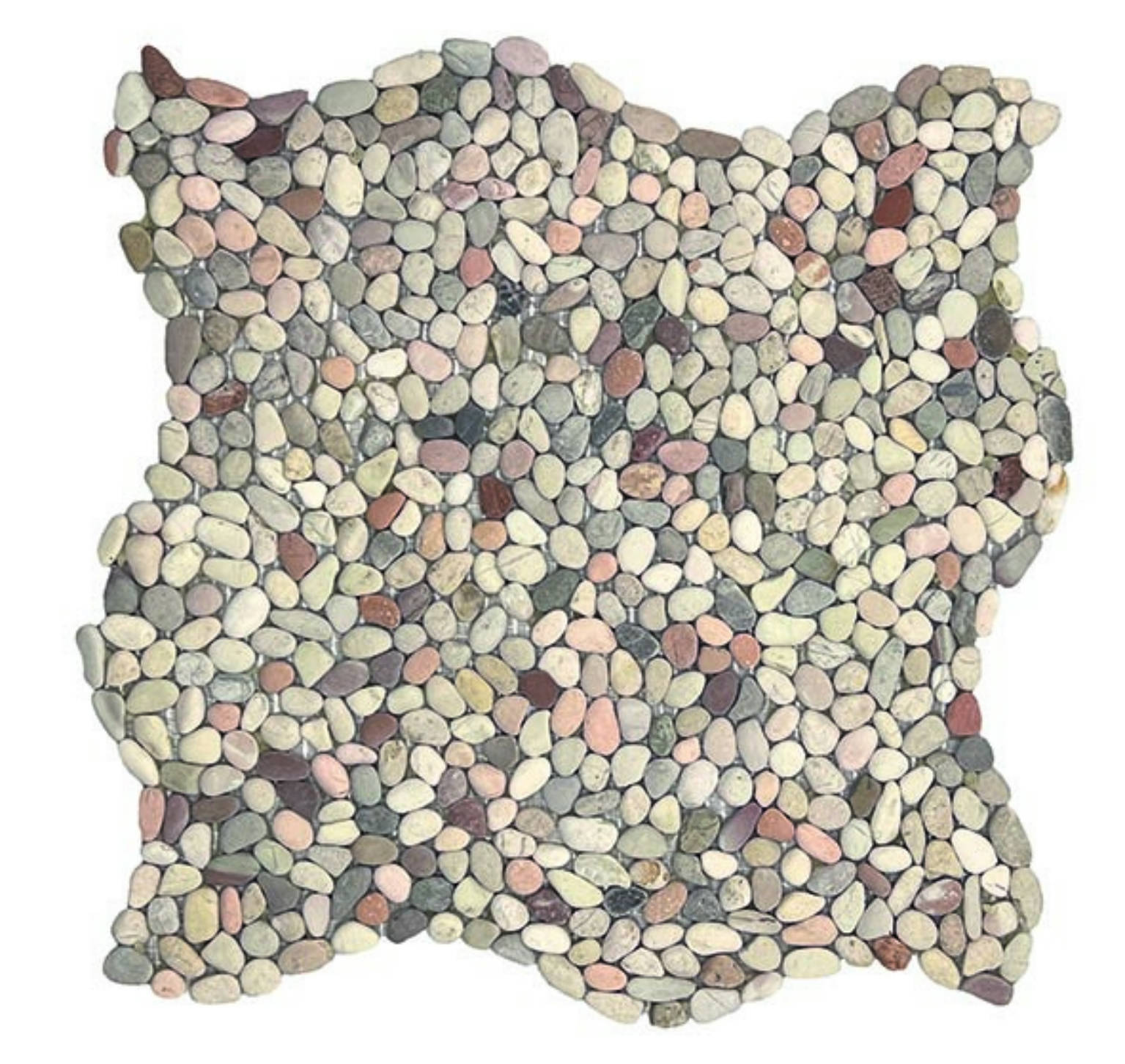 Mosaïque en mini galets naturels MINI PEBBLES MIX, idéale pour créer des surfaces fines, modernes et décoratives avec un mélange de teintes naturelles.