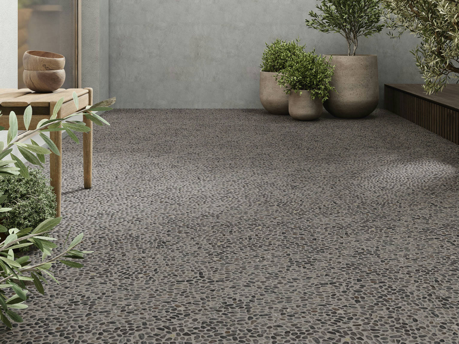 Mosaïque en mini galets naturels MINI PEBBLES NEGRO, idéale pour créer des espaces modernes avec un effet pierre noir élégant et structuré.