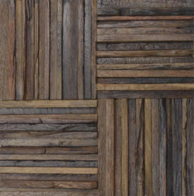 Ce modèle est composé de modules carrés formés par des lamelles de bois disposées perpendiculairement, créant un effet visuel dynamique et organisé.